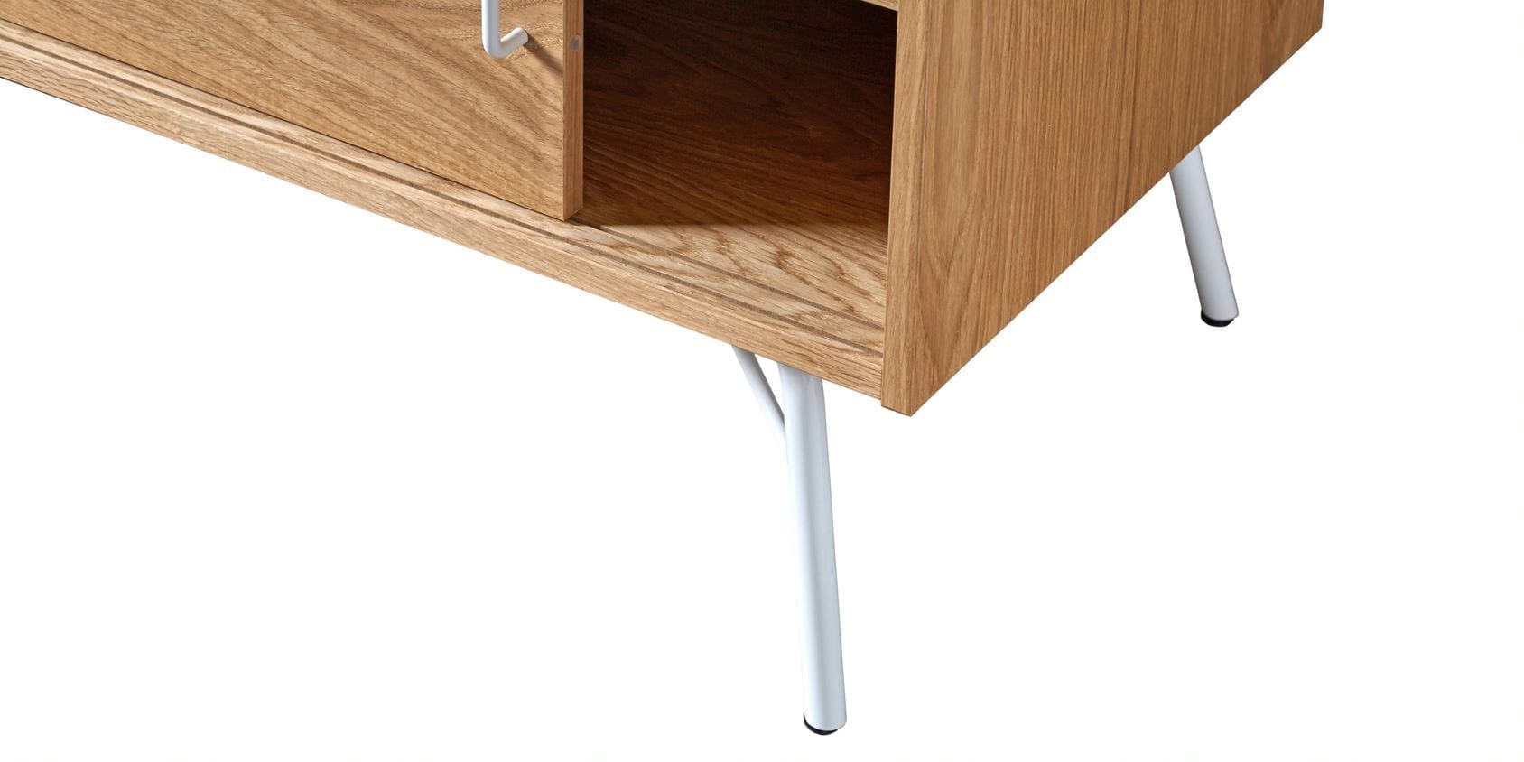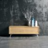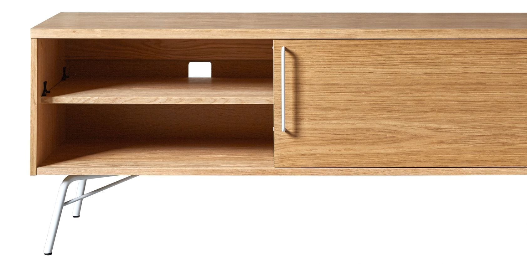 Ashburn Media Unit Skandinaavisen tyylikäs tv-taso moderniin kotiin. Arvokkaan oloinen tammiviilutettu media-taso, jossa 2 liukuovea. Kauniin kevyet jalkaosat ja vetimet valkoiseksi (RAL 9003) maalattua terästä.