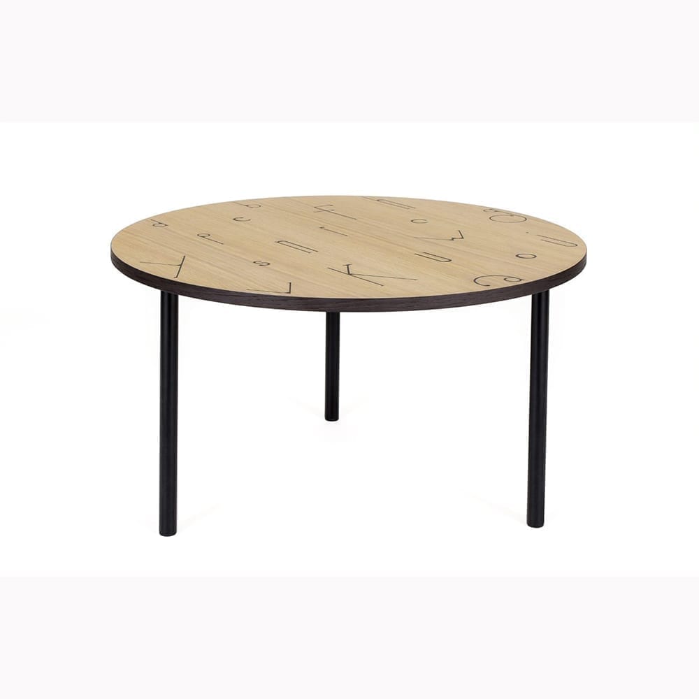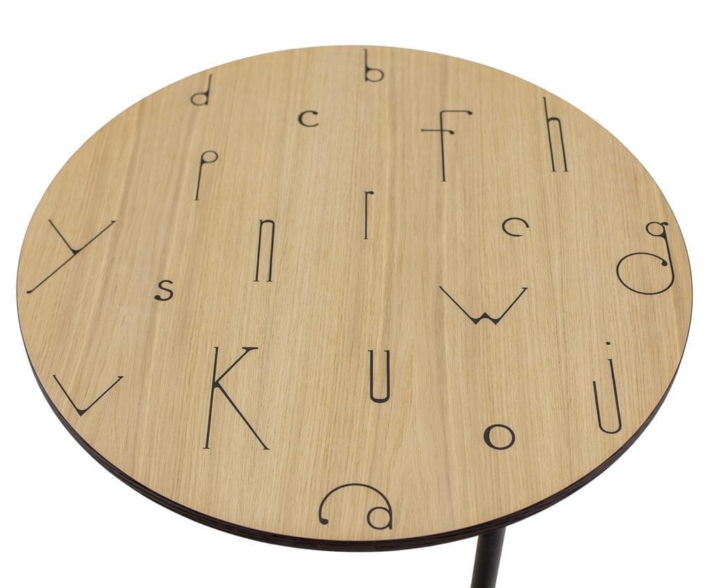 Arty Coffee Table 70 Letter  Nuorekkaan trendikäs sohvapöytä kauniilla koristeprintillä. Pöytätaso tammiviilutettua kalustelevyä ja tumma tammiviilutettu reunalista. Mustat metallijalat. Pöydän halkaisija: 70 cm ja korkeus 40 cm.