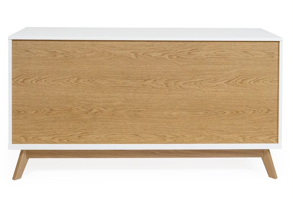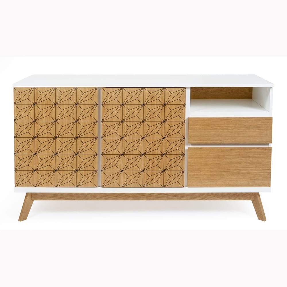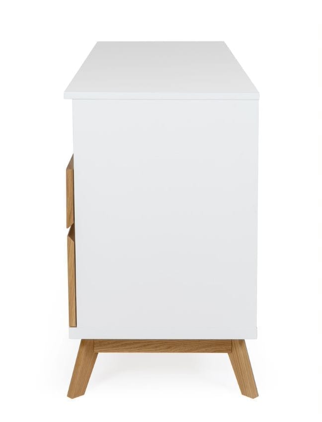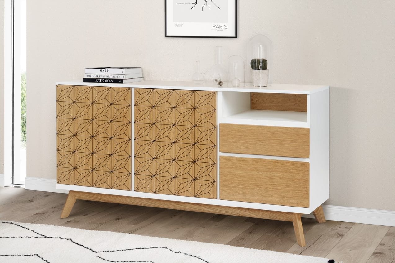 Bilboa Sideboard Print on nuorekkaan trendikäs ja raikkaan kaunis senkki, jossa onnistunut valkoisen värin ja tammen yhdistelmä sekä koristeprintti. Lipasto soveltuu hyvin olohuoneen, eteistilan ja ruokailutilan säilytyskalusteeksi.