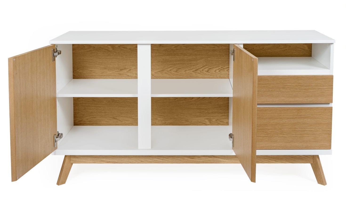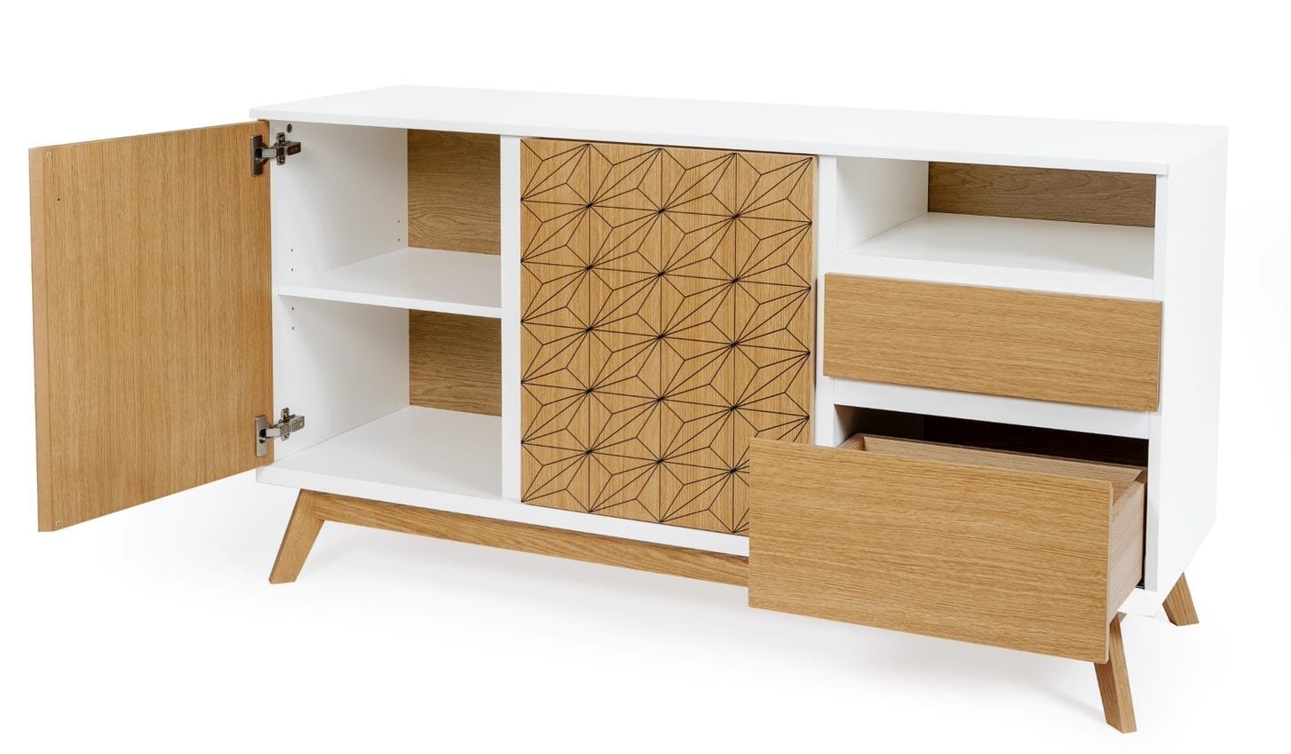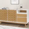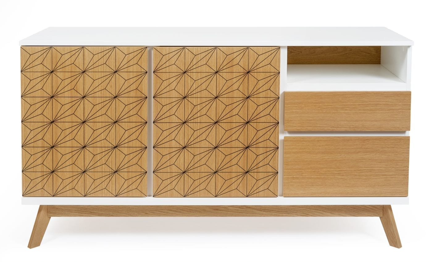 Bilboa Sideboard Print on nuorekkaan trendikäs ja raikkaan kaunis senkki, jossa onnistunut valkoisen värin ja tammen yhdistelmä sekä koristeprintti. Lipasto soveltuu hyvin olohuoneen, eteistilan ja ruokailutilan säilytyskalusteeksi.