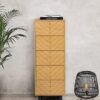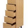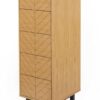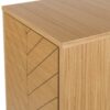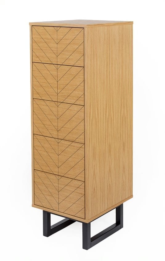 Camden Bedroom Chest Narrow Herringbone Print on trendikkään persoonallinen ja skandinaavisesti muotoiltu kaappi makuuhuoneeseen. Tammiviilutettu runko ja musta kalanruoto -koristeprintti vetolaatikkojen etulevyissä sekä mustaksi petsattu massiivipuinen jalusta ovat näyttävä yhdistelmä. Kaapin leveys 40 cm, syvyys 48 cm ja korkeus 123 cm.