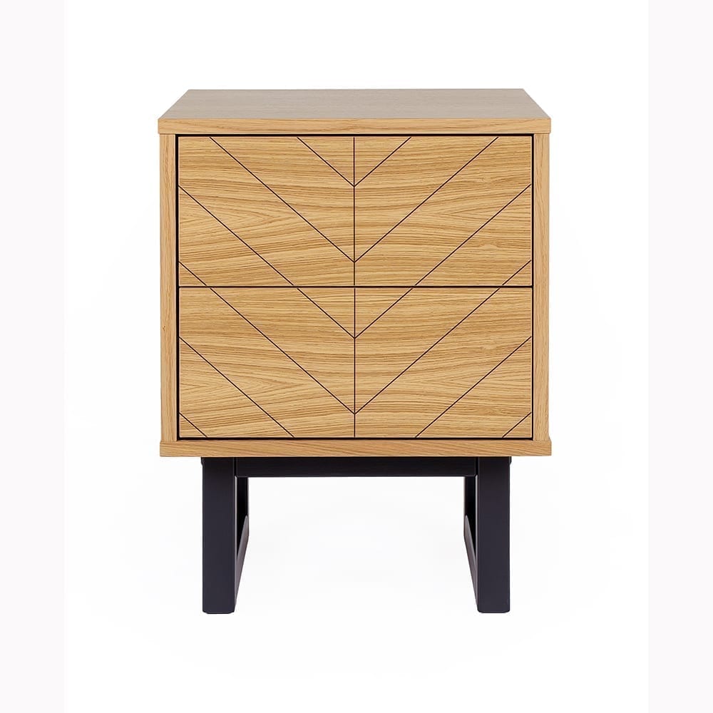 Camden Bedside Herringbone Print on trendikkään persoonallinen ja skandinaavisesti muotoiltu yöpöytä. Tammiviilutettu runko ja musta timantti -koristeprintti vetolaatikkojen etulevyissä sekä mustaksi petsattu massiivipuinen jalusta ovat näyttävä yhdistelmä. Yöpöydän leveys 40 cm, syvyys 40 cm ja korkeus 53 cm.