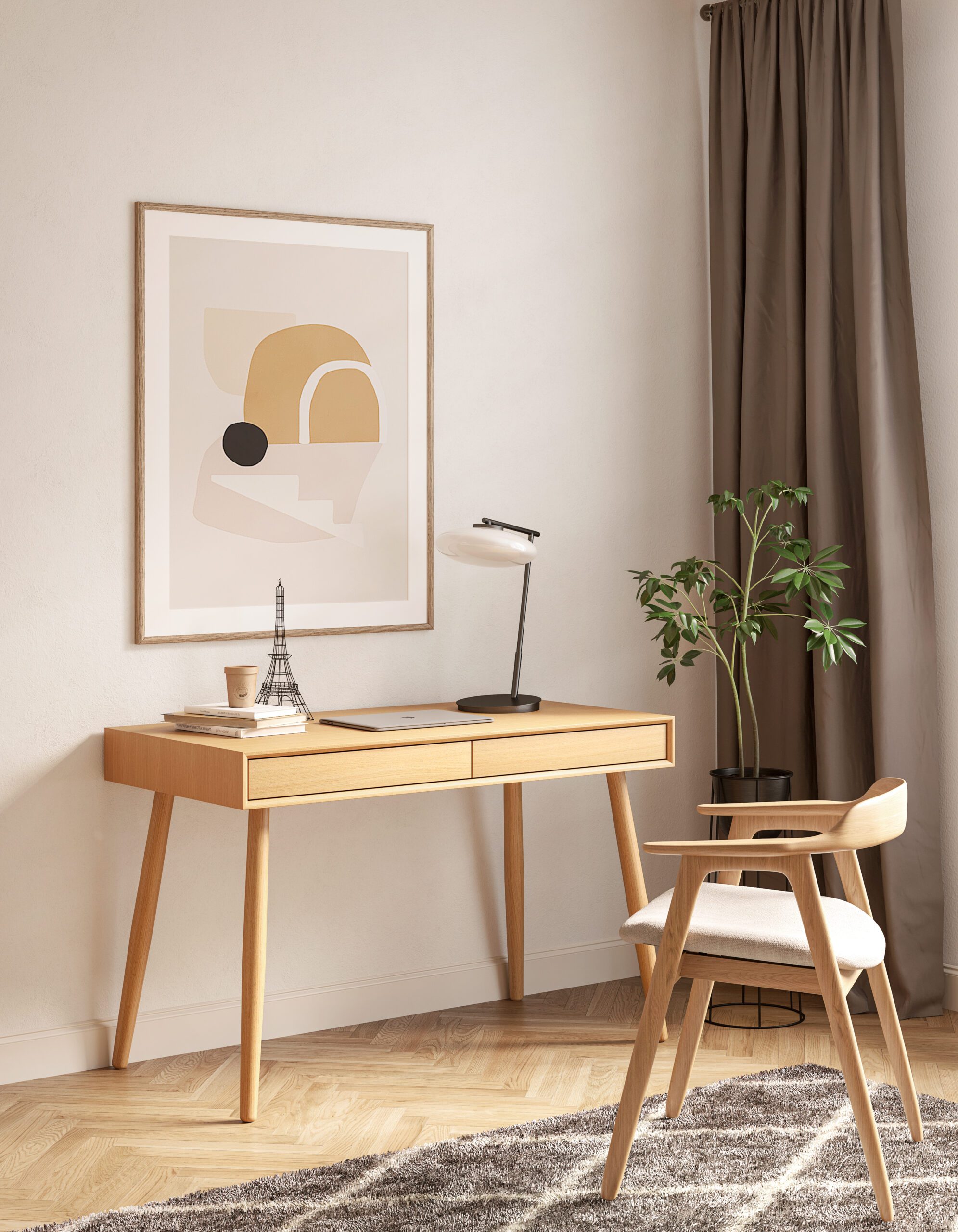 Carson työpöytä on ajattoman tyylikäs työpöytä kotitoimistoon. Pelkistetty muotoilu ja tammimateriaali sopivat hyvin skandinaaviseen sisustukseen.