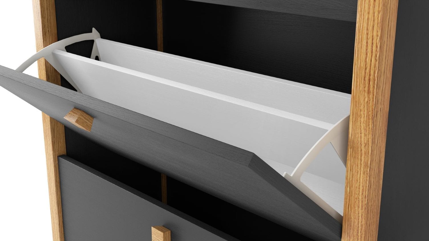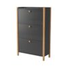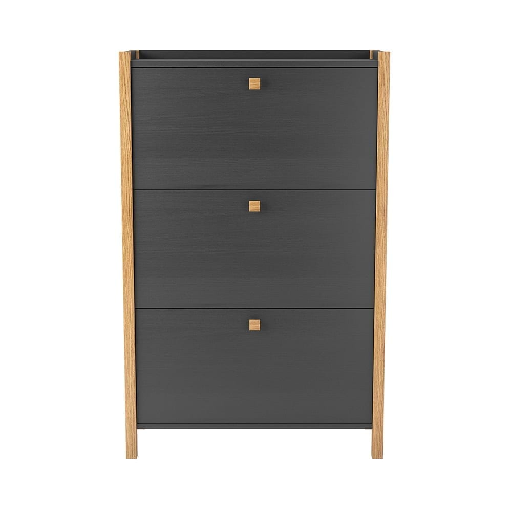 Hannover Shoe Unit – 3 door Kenkäkaapissa skandinaavinen muotoilu. Näyttävä tumman harmaan rungon ja koivumateriaalin yhdistelmä. 3-ovinen runko tumman harmaata melamiinia, kulmapalat ja vetimet massiivikoivua. Kenkähyllyjen mekanismit valkoista muovia. Tilaa noin 18 kenkäparille. Kaapin leveys 84 cm, syvyys 26 cm ja korkeus 132 cm.