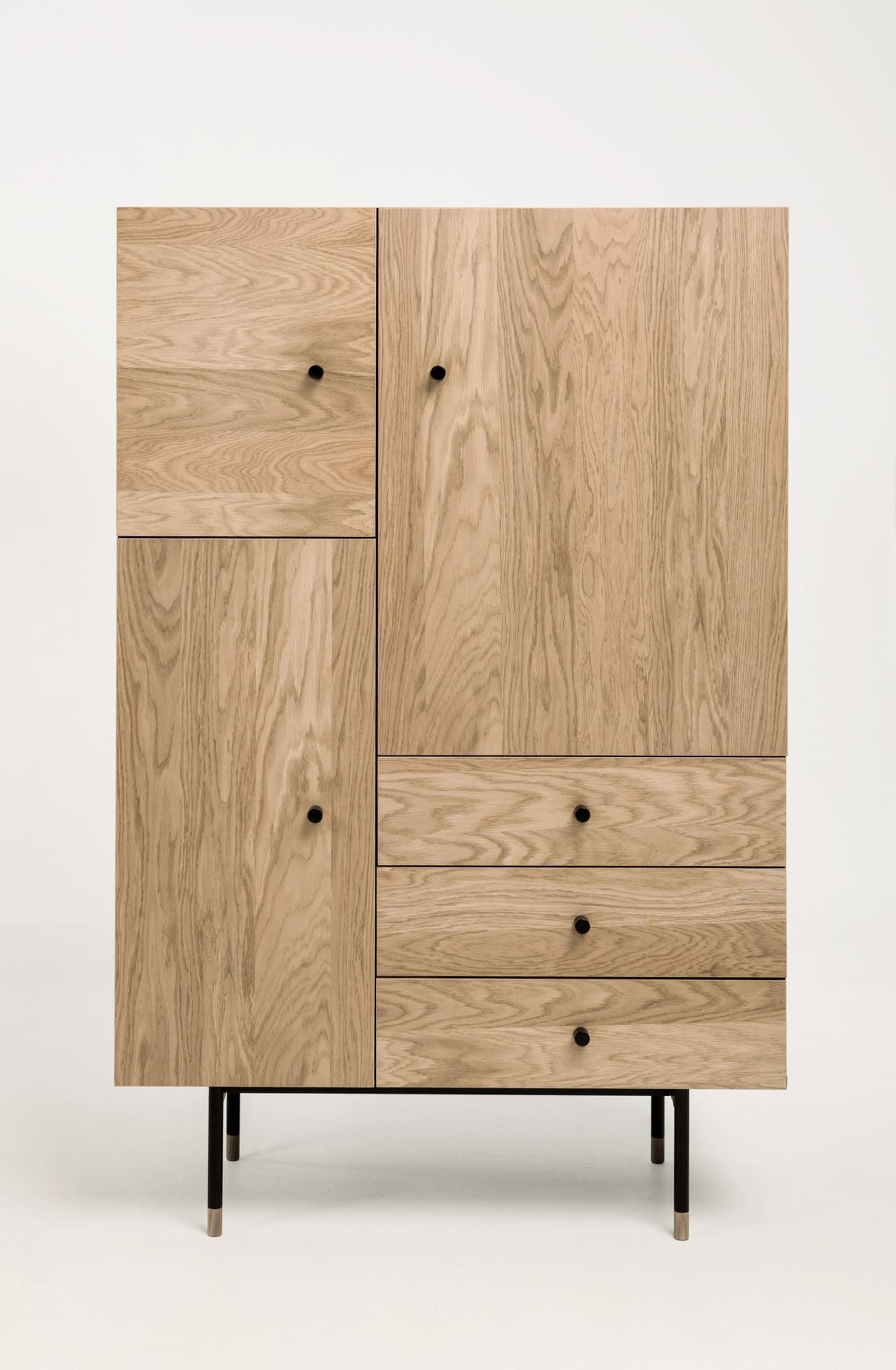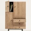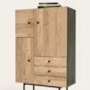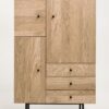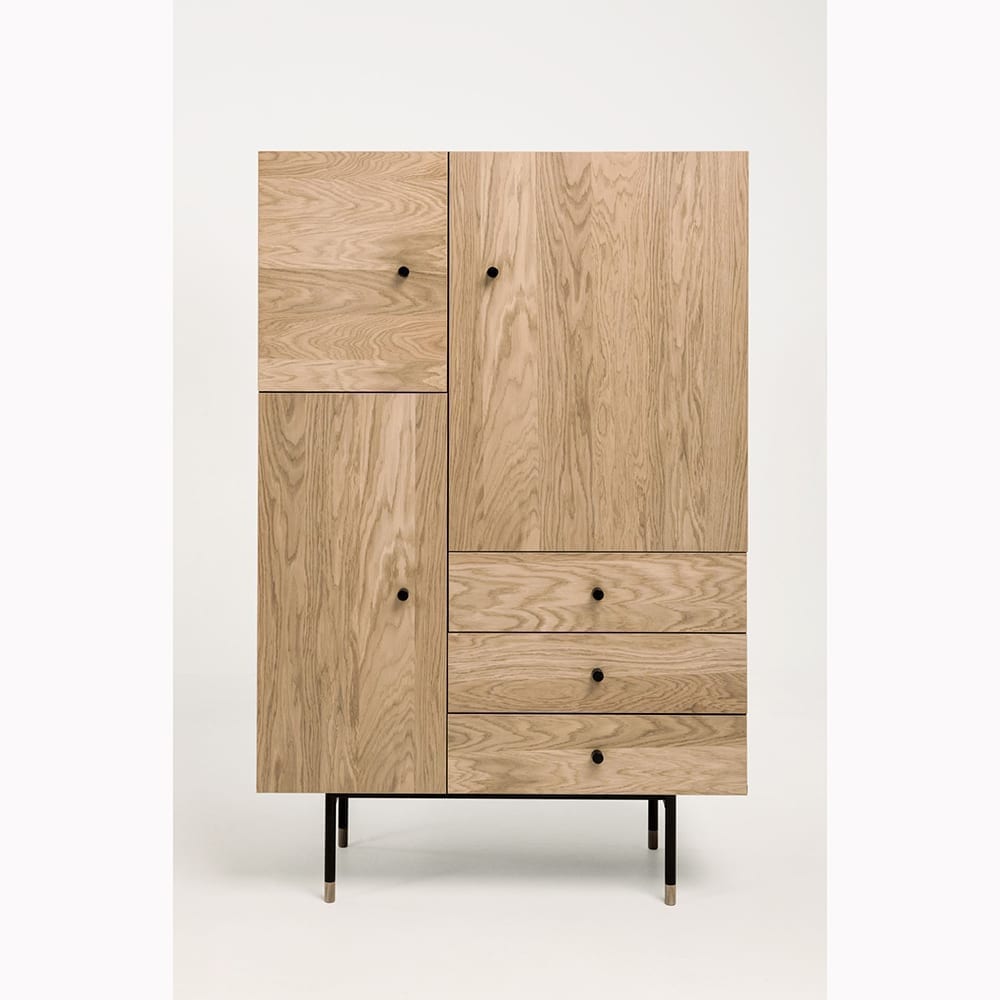Jugend Kaappi Runko mustaksi petsattua tammiviilua. 3 tammiviilutettua ovea. 3 tammiviilutettua vetolaatikkoa mustin vetimin. Korkeussäädettävät hyllyt. Ovissa ja vetolaatikoissa soft close sulkumekanismi. Mustat metallijalat, alaosissa tammiset koristeet. Lipaston leveys 90 cm, syvyys 42 cm ja korkeus 140 cm.