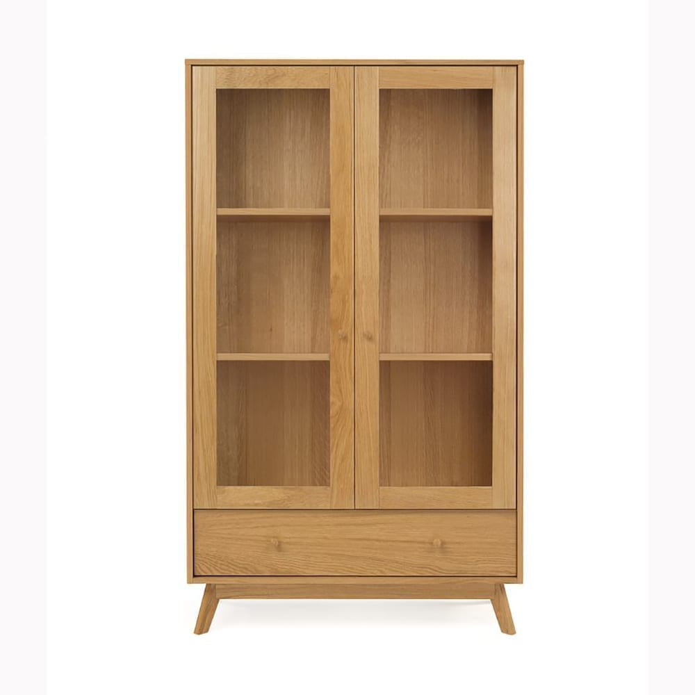 Kensal Vitriinikaappi Kaapissa tammiviilutettu runko ja hyllyt. Vetolaatikon etulevy melamiinia, metallikiskot. Kaapissa lasiovet (karkaistua lasia). Oven rungot tammiviilutettua MDF-levyä. Lasiovien takana kaksi hyllytasoa. Puuosissa puolihimmeä lakkaus. Jalat ja ovien vetimet massiivitammea. Kaapin kokonaisleveys 100 cm, syvyys 45 cm ja korkeus 170 cm.