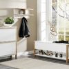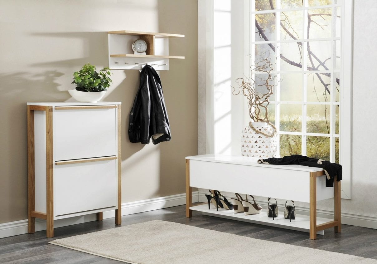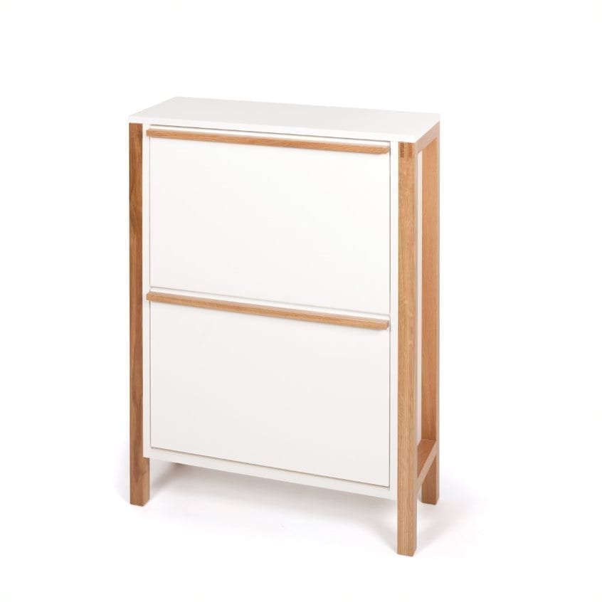 Northgate Shoe Cabinet 2 door Kenkäkaapissa skandinaavinen muotoilu ja näyttävä valkoisen kaapin sekä tammisen jalustan yhdistelmä. 2-ovinen runko valkoista melamiinia, jalusta ja vetimet massiivitammea. Kenkähyllyjen mekanismit valkoista muovia. Tilaa noin 10 kenkäparille. Kaapin leveys 65 cm, syvyys 27 cm ja korkeus 93 cm.