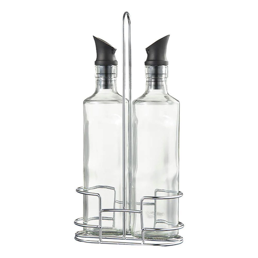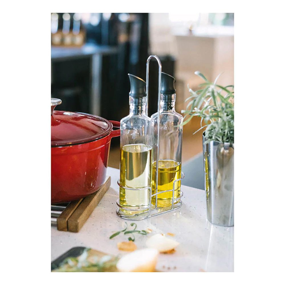 Tyylikkäästi esille laitettava öljy/etikkasetti ruokapöytään tai keittiöön. Teline terästä, pullot lasia.