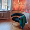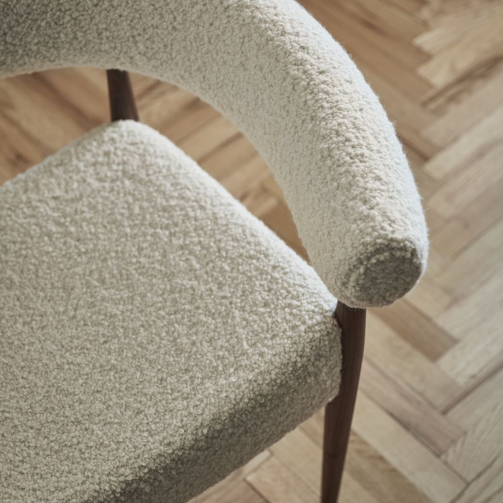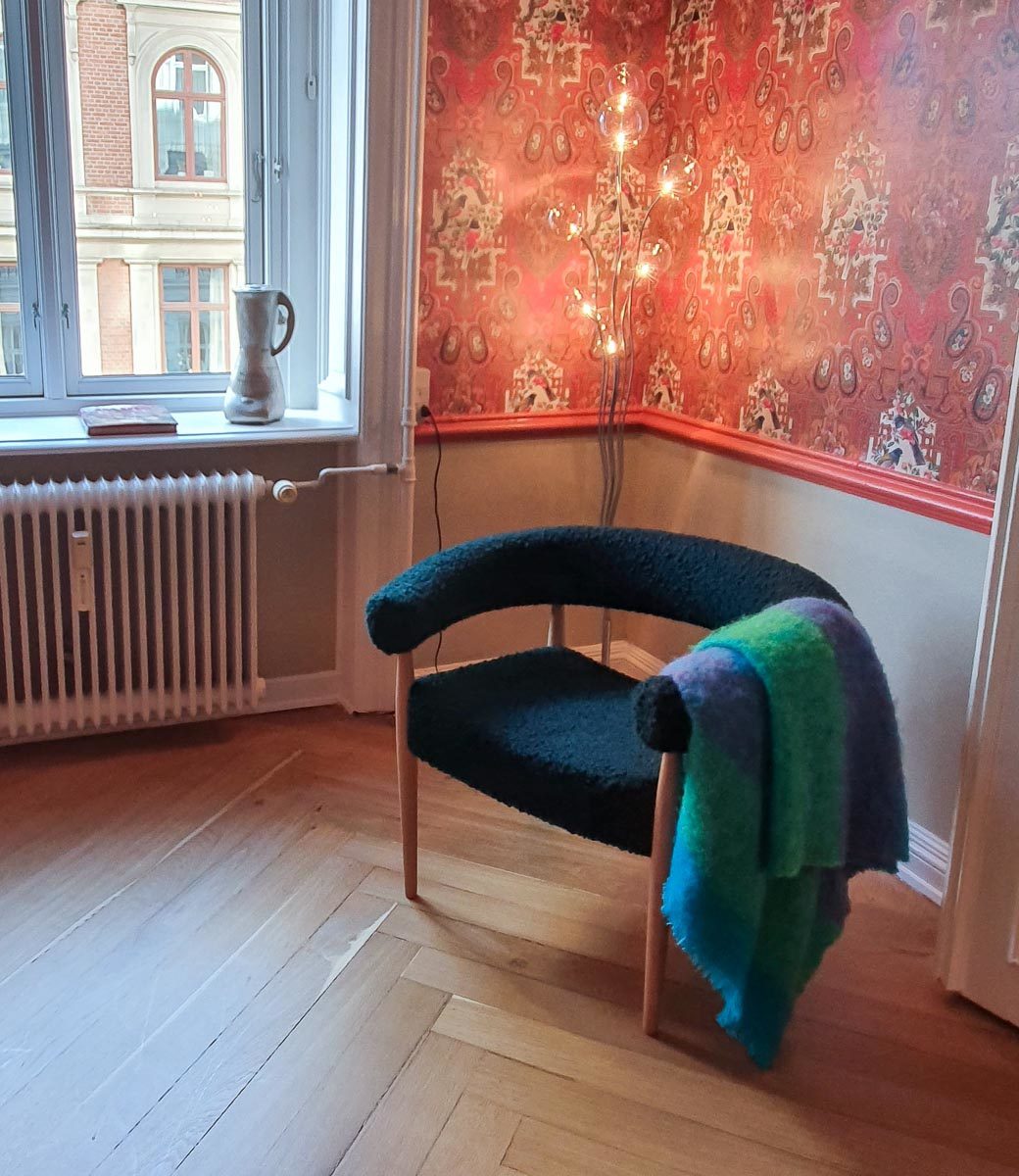 Ring -nojatuoli, runko öljyttyä pähkinäpuuta, istuin pehmustettu ja verhoiltu Pierre Frey:n Louison -kankaalla. Kaunis ja mukava istua!