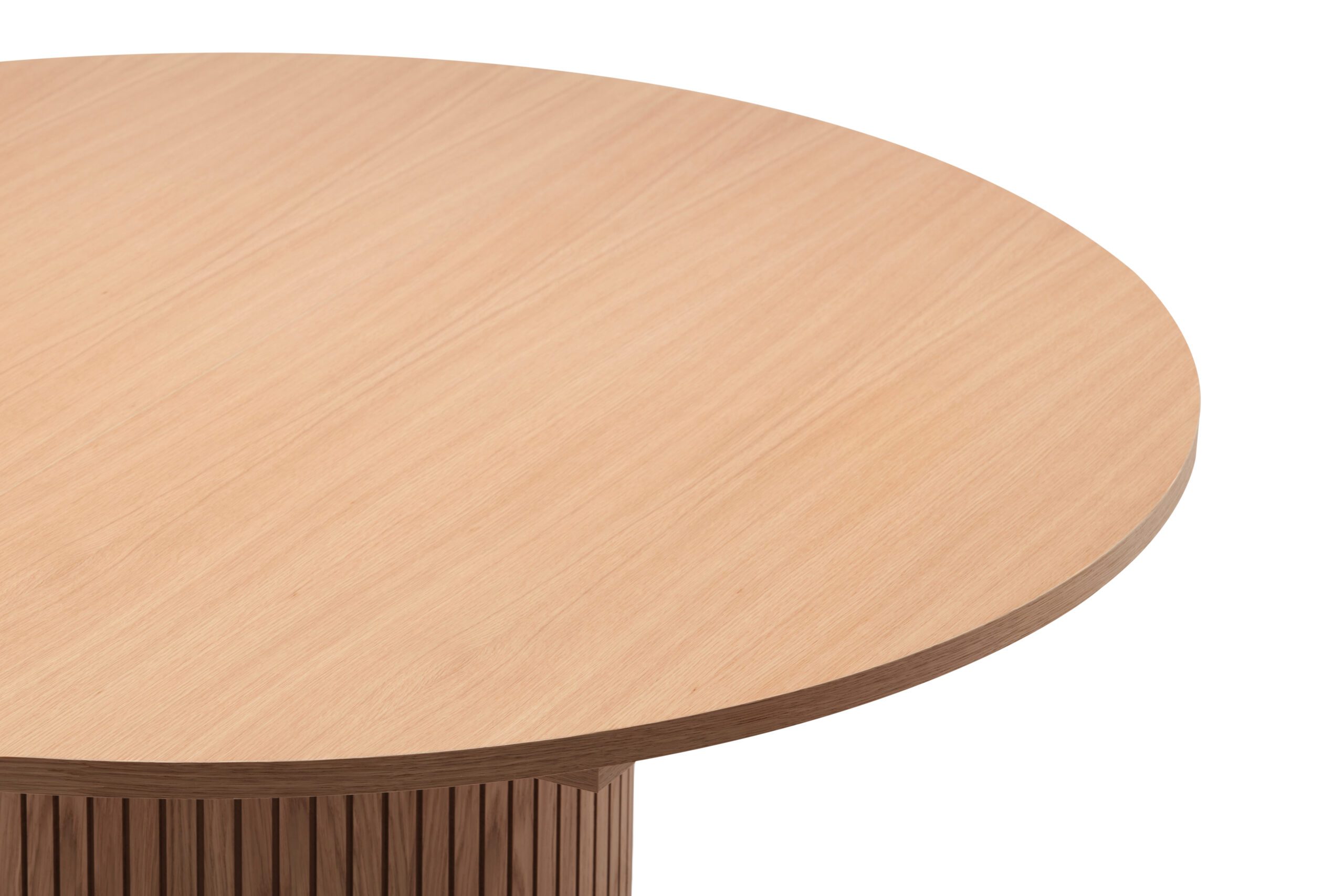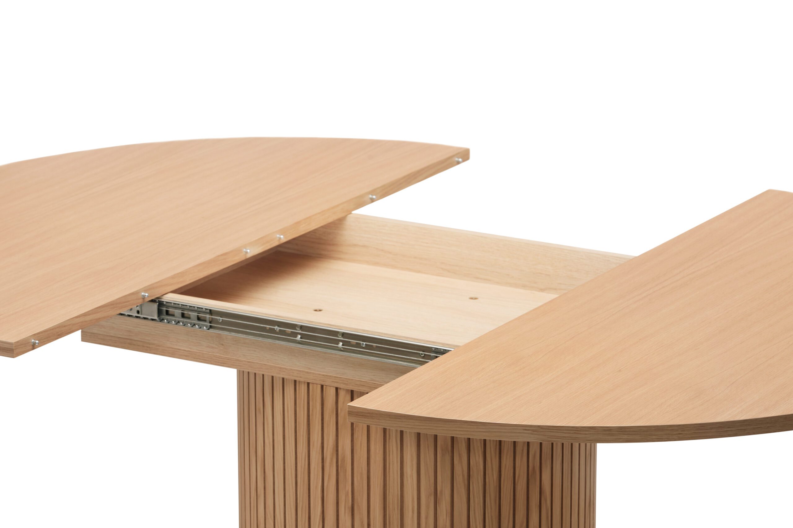 Toscana jatkettava ruokapöytä, halk. 120 cm, jatkettuna 160 cm ja korkeus 74 cm. Jatkopala 40 cm. Soveltuu 4-5 hengelle, jatkettuna 6-8 hengelle. Pöytälevy tammiviilutettua kalustelevyä ja jalkaosa massiivitammea ja tammiviilutettua MDF-levyä. Korkeus lattiasta pöytälevyn alusrakenteeseen (jatkopalan säilytyslaatikko) 63.1 cm. Pöytälevyn vahvuus 2.3 cm. Jalustan halk. 50 cm. Pintakäsittely: lakkaus. Kalusteen kokonaispaino: 24 kg.
