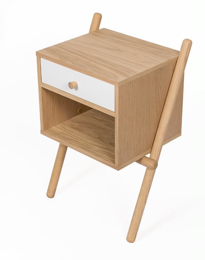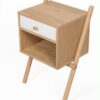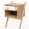 Wiru Side Table White 1D   Trendikäs ja skandinaavisesti muotoiltu yöpöytä. Tammiviilutettu runko ja jalat massiivitammea. 1 valkoinen vetolaatikko, metallikiskoin ja 1 avohylly. Yöpöydän leveys 51 cm, syvyys 35 cm ja korkeus 71 cm.